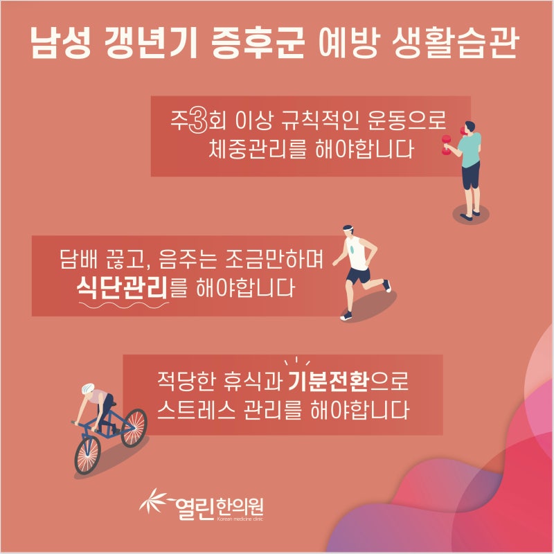 여기서 항상 염두에 두어야 할 부분은 지금까지 논의된 신체적, 정신적, 성적 증상이 복합적으로 나타난다는 점이다. 각 증상은 유기적으로 얽혀 남성의 건강과 삶에 악영향을 미치기 때문에 갱년기 증상을 근본적으로 극복하기 위해서는 종합적인 관리가 필요하다.