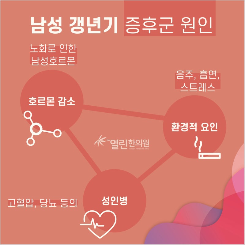 갱년기 증상의 주요 원인은 남성호르몬의 감소인 것으로 알려져 있으며, 생애주기 변화의 관점에서 볼 때 호르몬은 20세 이전에는 지속적으로 증가하다가 30세 이후부터는 점차 감소하여 매년 약 1.2%씩 감소하게 됩니다. . 아주 작은, 30대에 이르면 신체 기능의 저하를 뚜렷하게 느낄 수 없다. 그러나 최근에는 건강하지 못한 생활습관, 피로, 스트레스 등 환경적 요인의 영향으로 남성호르몬의 변화폭이 넓어져 신체기능이 저하되었다고 느끼는 분들이 많습니다.