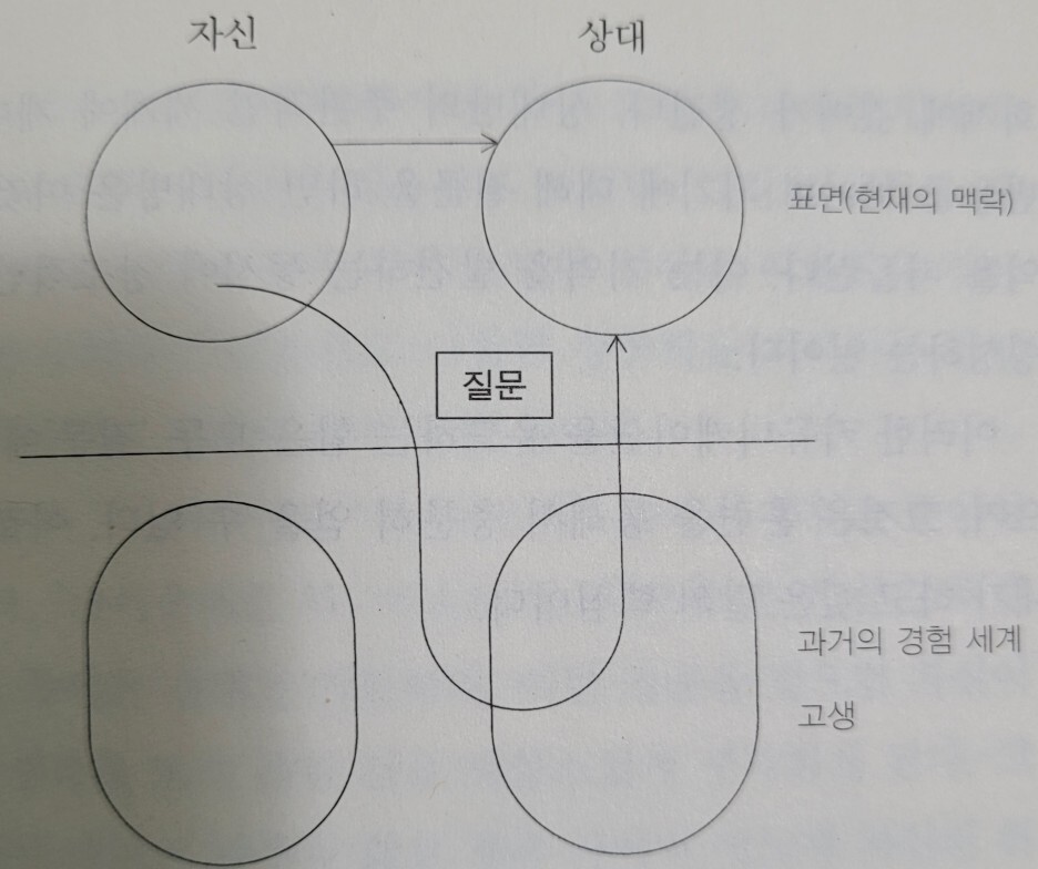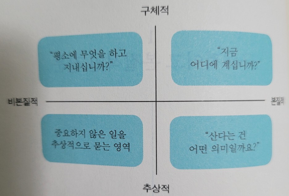 저자는 우리가 묻는 질문을 다음과 같이 세분화할 수 있다고 말한다. 우리가 묻는 질문은 구체적입니까 아니면 추상적입니까? 아니면 필수인가 비필수인가? 자신과 타인에게 하는 일 질문은 아래 표와 같이 분류할 수 있으며 항상 이것은 당신이 묻는 질문에 대해 실질적이고 구체적인 질문을 하도록 노력해야 한다는 것을 의미합니다. 물론 가끔은 필수적이지 않지만 구체적인 질문이 필요한 상황이 있습니다. 있다고 합니다. 얼음 깨듯이 분위기를 바꾸려면 다소 쉬운 질문부터 시작하는 것도 한 방법인 것 같아요.