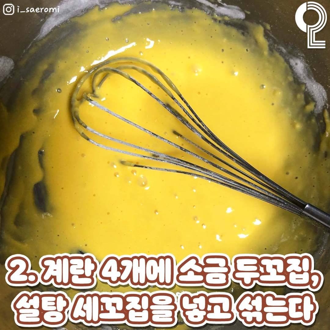 계란 4개를 풀고 소금 2꼬집, 설탕 3꼬집을 넣고 섞는다