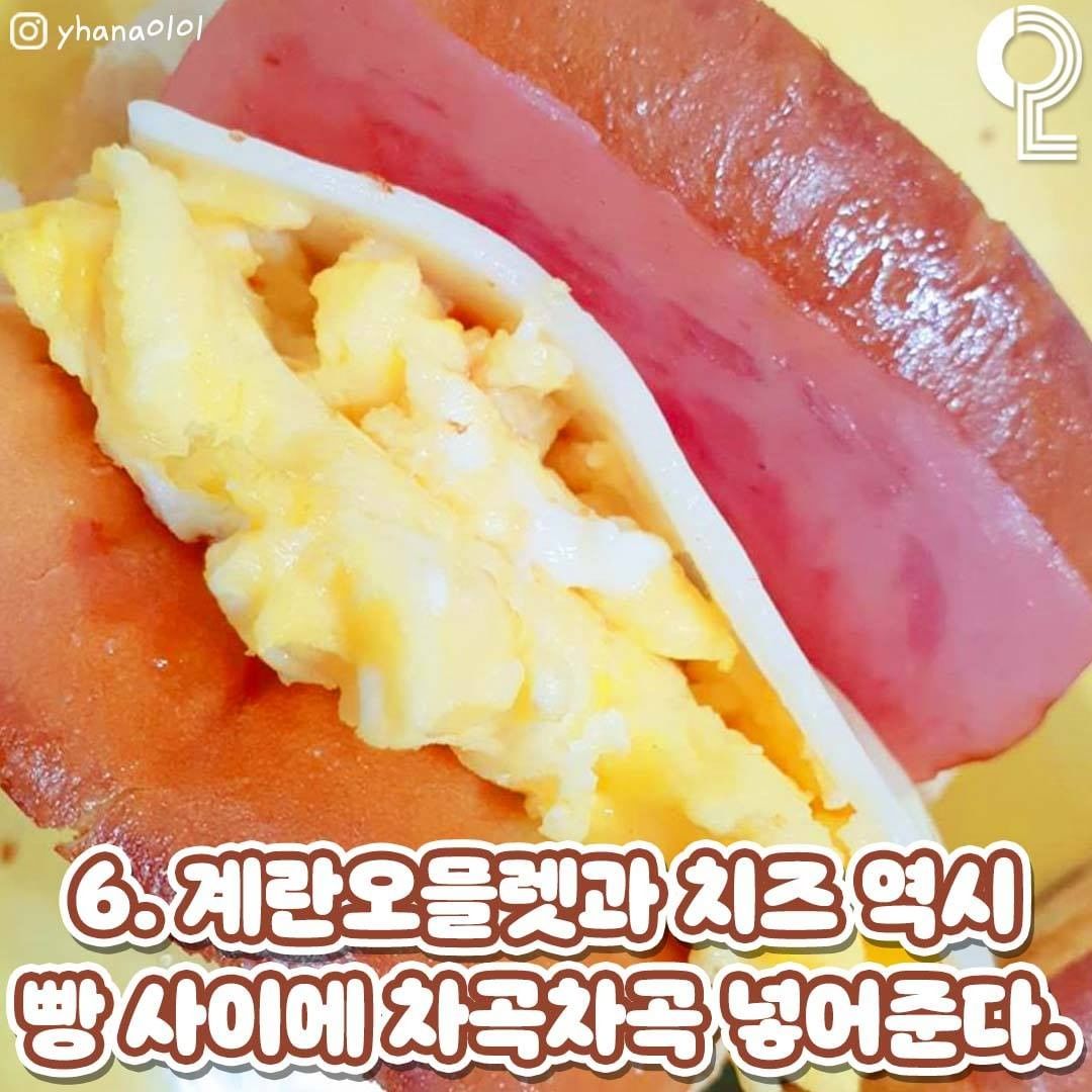 계란 오믈렛과 치즈도 빵 사이에 넣습니다.