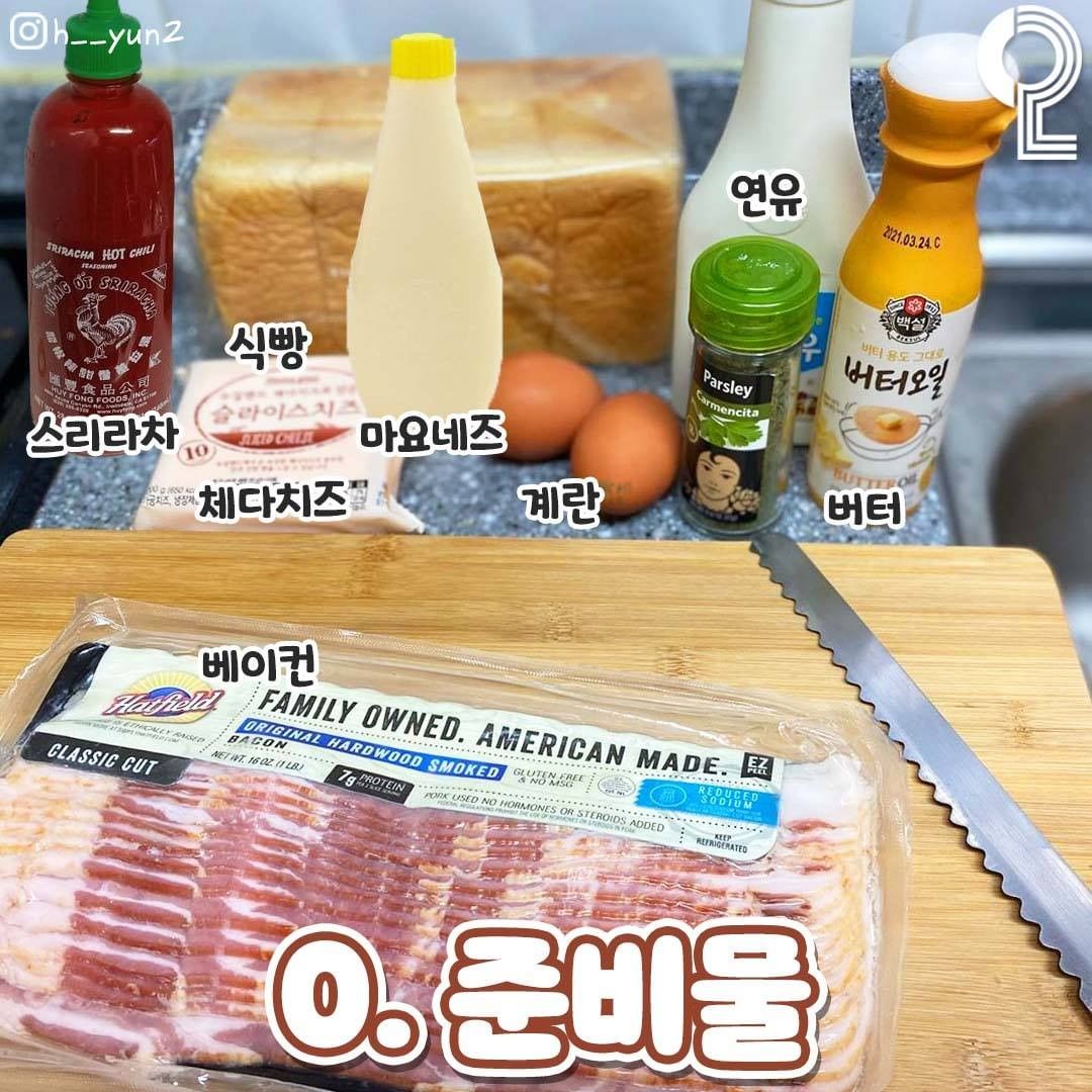 재료 : 스리라차 소스, 식빵, 베이컨, 체다치즈, 마요네즈, 계란, 연유, 버터, 파슬리