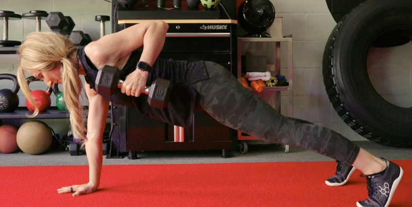원암 로우 동작을 위해 덤벨을 들어올릴 때 무게와 움직임의 균형을 맞추기 위해 발을 엉덩이 너비보다 약간 넓게 벌리고 플랭크 자세를 취하세요.