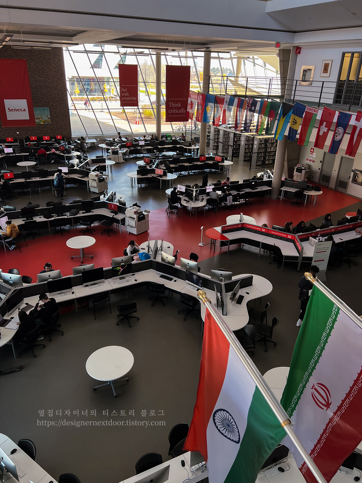 조금 일찍 도착한 나는 잠시 교실 밖을 둘러보았다. 위에서 보면 도서관과 컴퓨터를 사용할 수 있는 공간이 있습니다. 태극기가 걸려있는 곳이라 태극기를 찾는 애국자입니다.