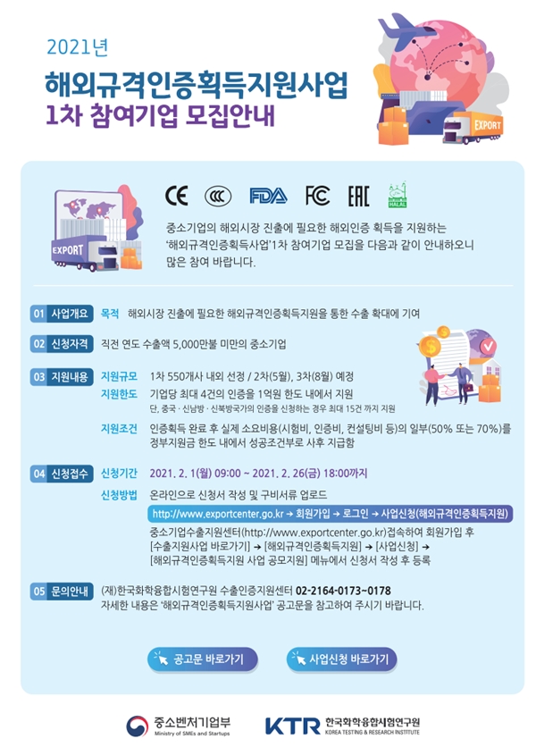 “해외규격인증 취득지원사업”의 공고 및 자세한 사항은 중소기업청 홈페이지(www.mss.go.kr), 중소기업24 홈페이지(www.smes).go에서 확인할 수 있다. kr), 해외표준인증취득지원센터 홈페이지(www.mss.go.kr), www.smes.go.kr/globalcerti) 또는 기업연구원 홈페이지(www.bizinfo.go.kr). 표준인증 취득 지원 프로그램을 예로 들면, 참여 기업은 평균적으로 1개월 이내에 선정 여부를 확인할 수 있으며, 더 기다려야 하는 기업의 경우 지난 2~3개월과 비교하면 그 효과는 확연히 드러난다. 우리는 사업의 효율성을 지속적으로 향상시키기 위해 개선하면서 긍정적으로 대응할 것입니다.이영 중소벤처기업부 장관