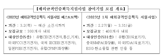 【해외 규격 인증 취득 지원 사업 모집 개요】 전력전자, 통신, 기계), 미국 FCC(전기전자), 국제 IECEE(전기전자), 일본 PSE(전기전자), 유럽 CPNP(화장품)<2023年第1次海外标准认证取得支援项目>기간 : 2.27(월) ~ 3.31(금) 모집규모 : 약 400개사(531종) 유럽 인증대상(의료기기), 중국 NMPA(화장품), 미국 FDA(의료기기), ESG 탄소중립 관련 인증 등