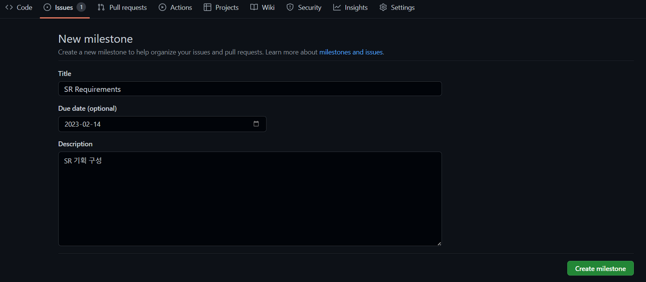 • Description에 마일스톤에 대한 설명을 자유롭게 작성한 후 Create Milestone 클릭