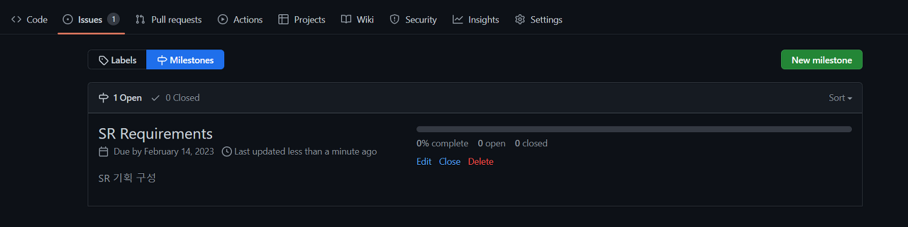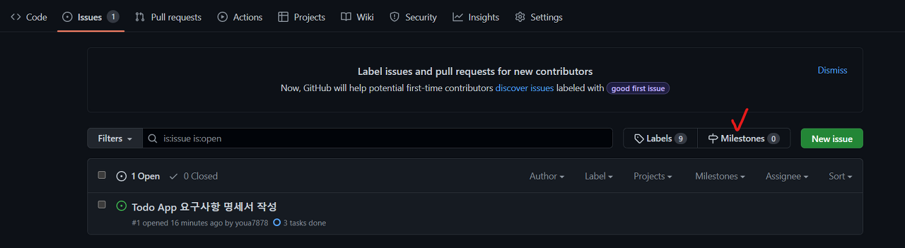 1. 이슈 탭 > 마일스톤을 클릭합니다.